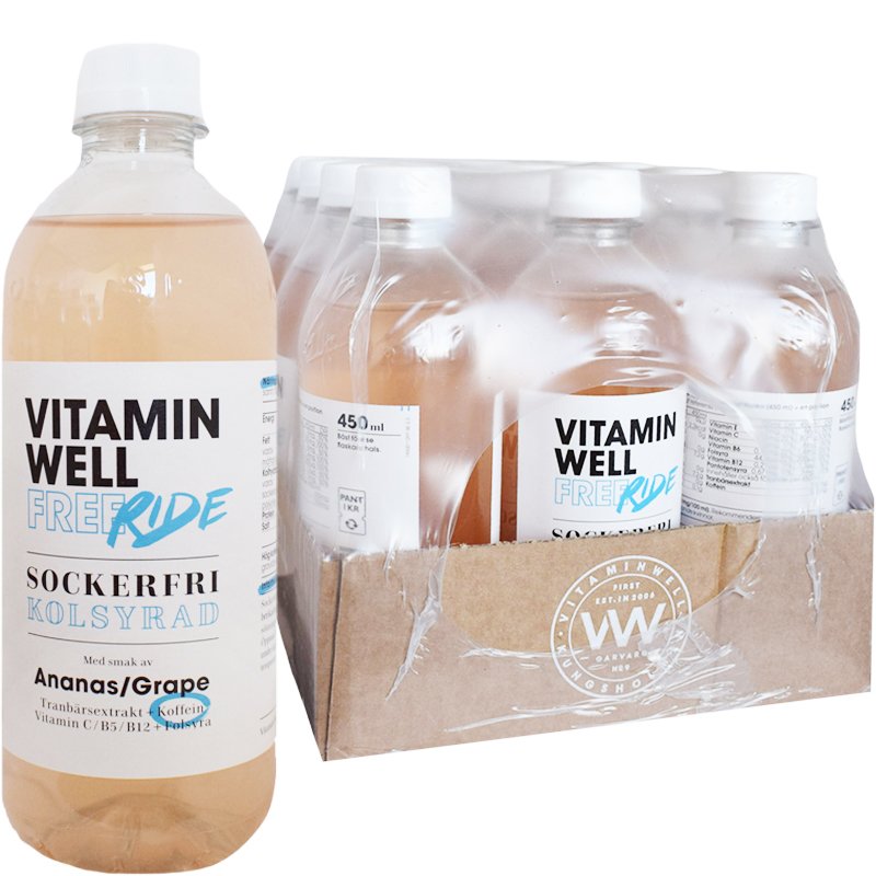 Tolv stycken kolsyrade och sockerfria drycker med smak av ananas och grape. Innehåller tranbärsextrakt, koffein, vitamin C, B5, B12 och folsyra.