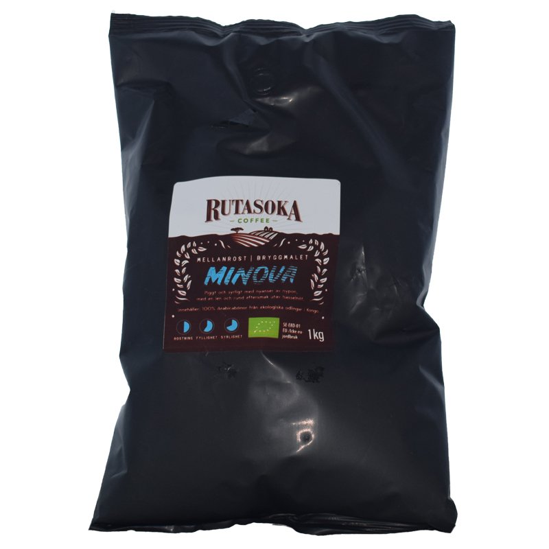 Minova bryggkaffe från Rutasoka med 100% Arabicabönor. Piggt och syrligt kaffe med nyanser av nypon med en len och rund eftersmak av hasselnötter.