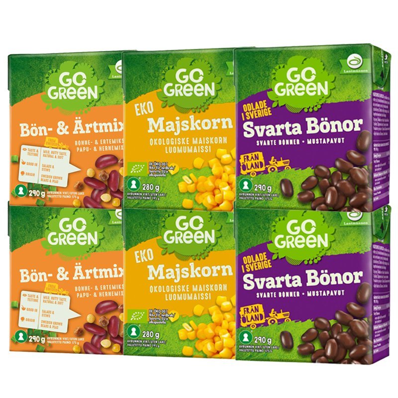 Passa på att fylla på skafferiet med detta paket från GoGreen!Paketet innehåller: Eko Majs 2 x 280g, Svarta Bönor 2 x 290g & Bön- & Ärtmix 2 x 290g.