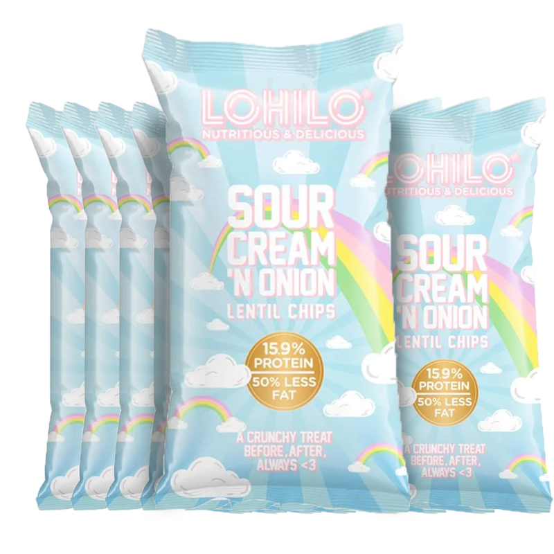 Linschips med extra protein och mindre fett från Lohilo med smak av sourcream & onion, totalt 10 förpackningar.