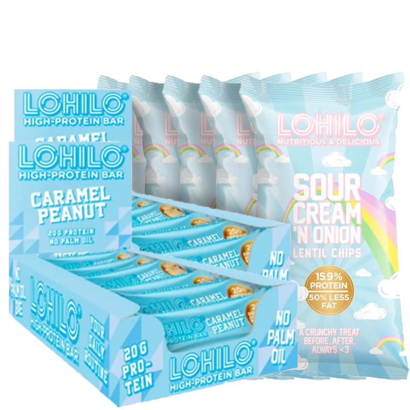 Paketet innehåller: Proteinbars från Lohilo med smak av karamell och jordnöt, 20g protein per bar. Totalt 24 bars samt linschips med extra protein och mindre fett från Lohilo med smak av sourcream & onion 5x90g.