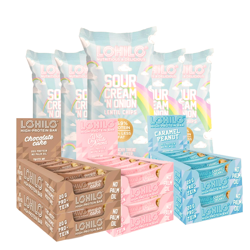 Paketet innehåller: Proteinbars Karamell & Jordnöt 2x12x55g, Proteinbars Vit Choklad & Mandlar 2x12x55g, Proteinbars Chokladkaka 2x12x55g och Linschips Sourcream & Onion 5x90g.