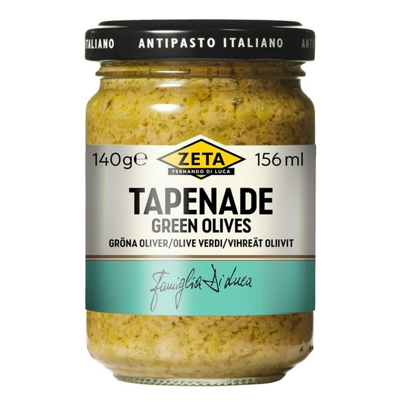Tapenade av finhackade gröna oliver, sardeller, kapris, vitlök och olivolja. Perfekt på antipastifatet, på en crostini, rostat eller grillat bröd. Utmärkt som smaksättare till kokta primörer, kycklingrätter, pasta, på ägghalvor och mycket mer.